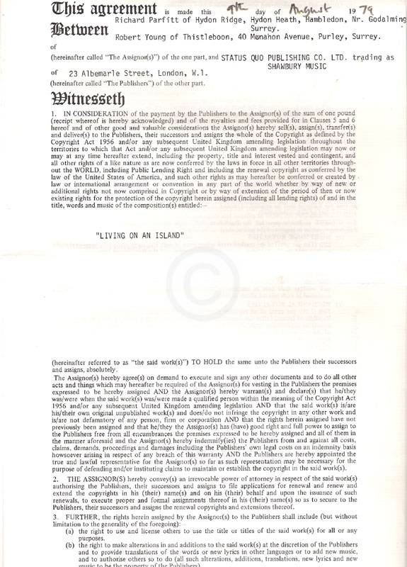1979 Parfitt / Young song publishing agreement for 'Living On An Island'
