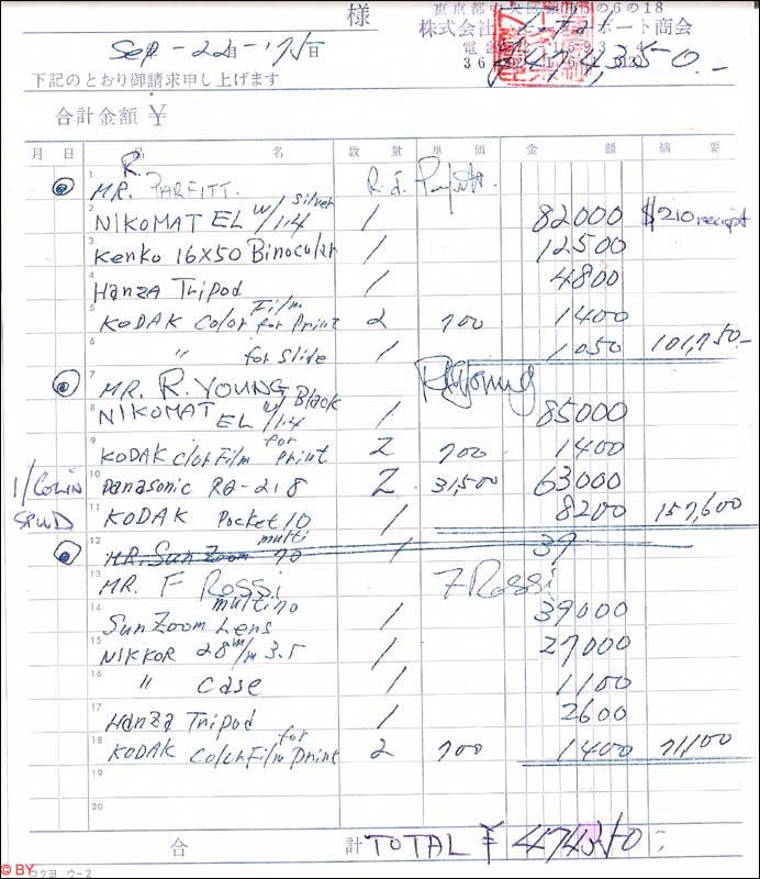 Receipt for the cameras we bought on the first Japanese Tour. I still have my camera & lens. Rick went on to buy enough photographic equipment to start up a professional studio…..as you do.