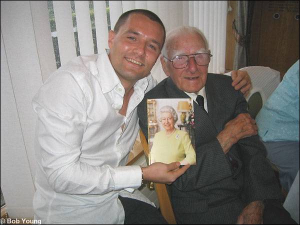 2007 another Uncle Bill 100th birthday photo with my son Sam holding the card from the Queen.