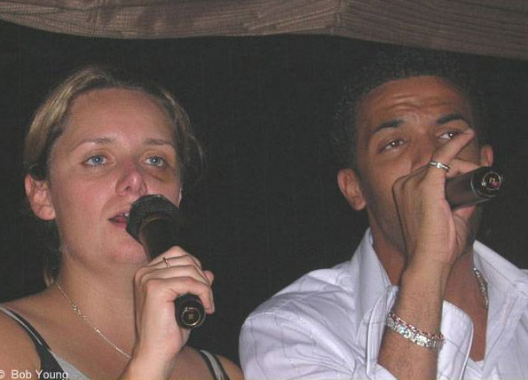 back to photo index 2006 daughter Kirstie singing karaoke in a Tokyo bar with Craig David. Her black eye came from a crash in the taxi on her way to Heathrow airport.
