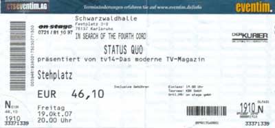 Aber bei Status Quo ist es egal was an Songs gespielt wird. Du musst ein Status Quo Konzert unter dem Gesichtspunkt sehen, dass da 90 oder 100 Minuten lang Rock-Party pur angesagt ist, Du darfst keine grossartigen Improvisationen erwarten. So wie in Karlsruhe, als der Funken wieder direkt von der Band zu den Fans übersprang oder war es umgekehrt?