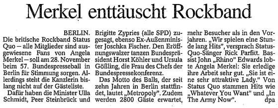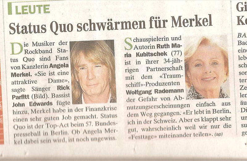 - 28.11.: das heutige Medienereignis, der Bundespresseball in Berlin rückte auch Status Quo in den Vordergrund des Interesses. Die Band war als Show-Act eingeladen und spielte dort auf. Die Fernsehaufzeichnung wird am Sonntag um 17.40 Uhr im RBB-Fernsehen ausgestrahlt.
