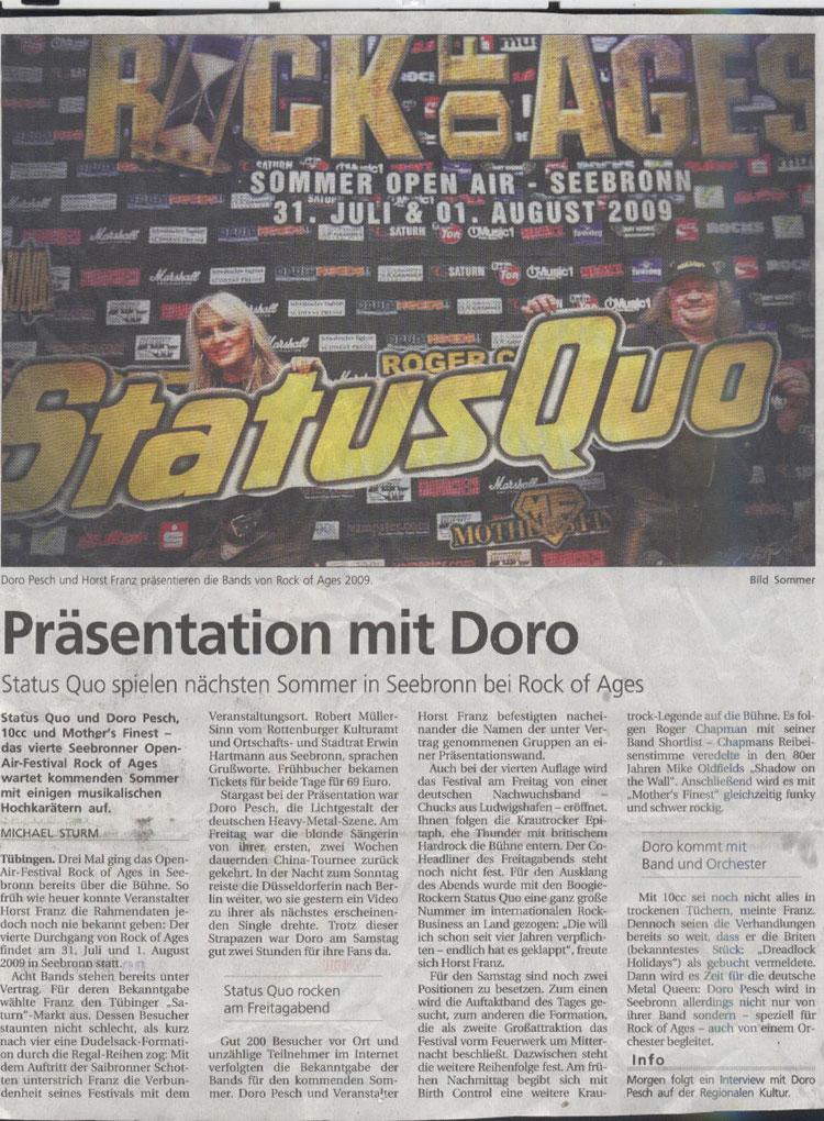 - 22.11.: gerade eben auf der Pressekonferenz in Tübingen verkündet; Status Quo werden einer der Headliner des mehrtätigen Rock-of-Ages-Festival 2009 in Seebronn (ca.35 km von Stuttgart) sein. Weitere Bands sind auch schon bestätigt; Doro Pesch, Roger Chapman, Mother Finest, Birth Control und Epitaph.