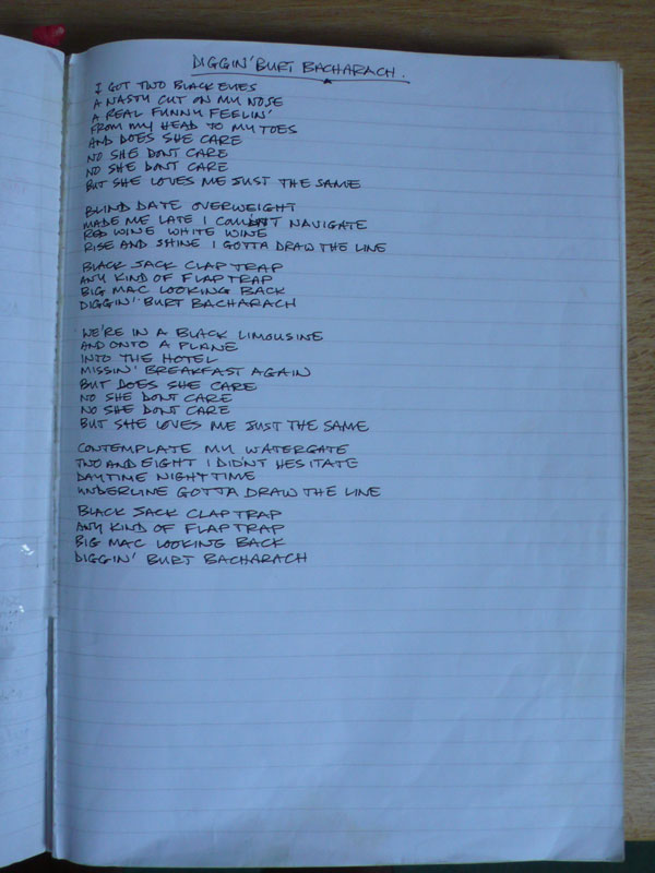 handwritten lyrics 'Diggin Burt Bacharach'.