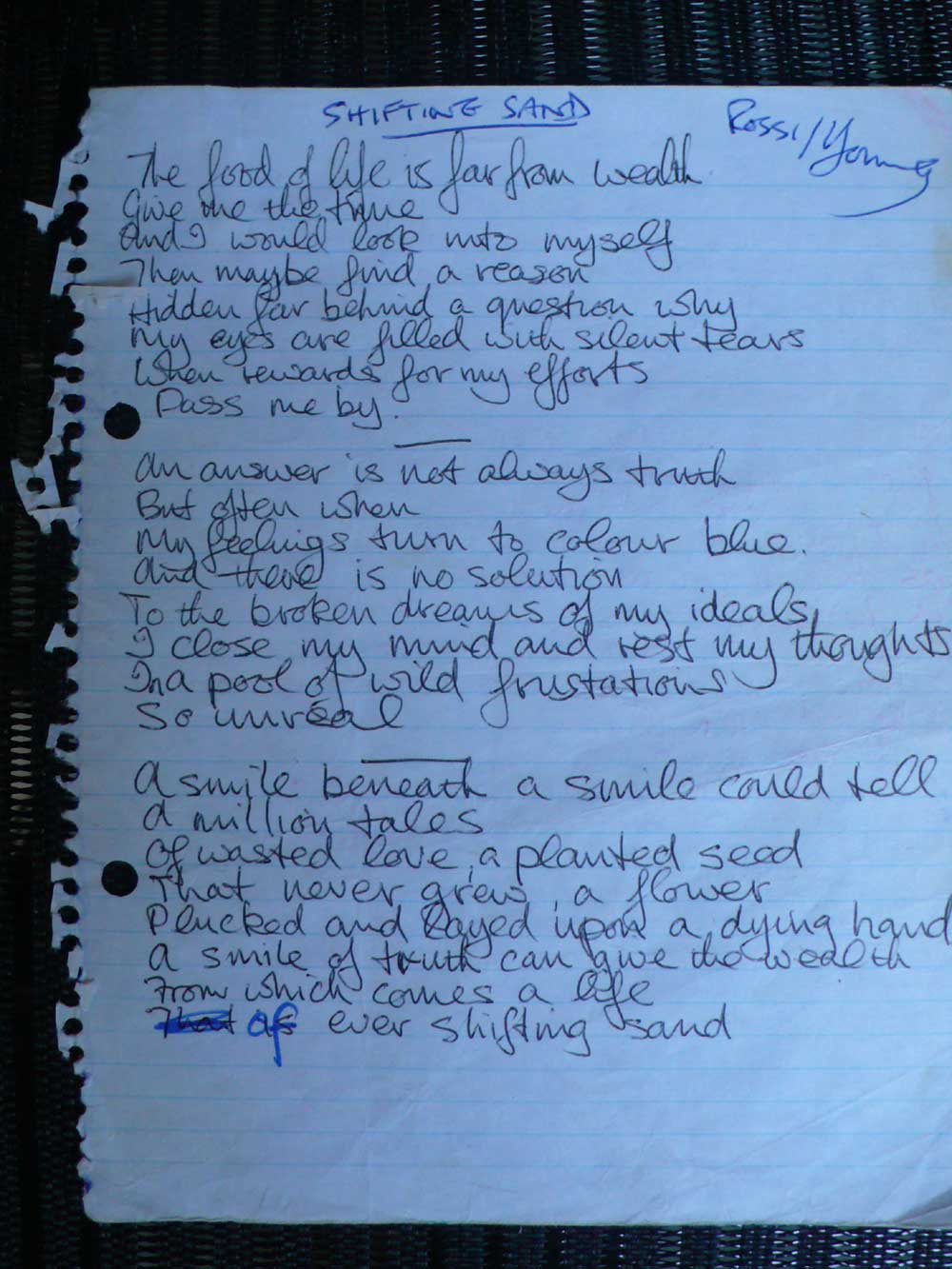 handwritten lyrics 'Shifting Sands'.