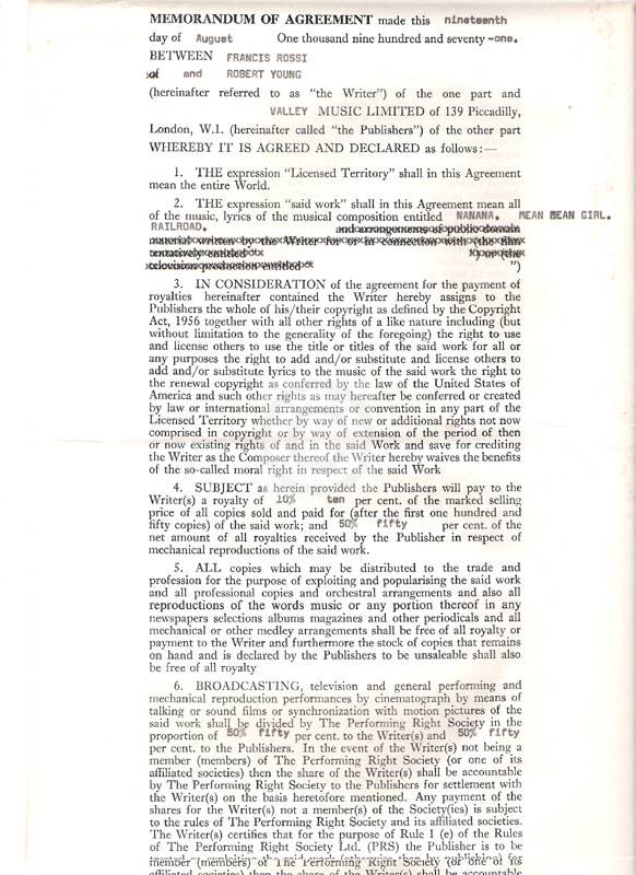 1971 Rossi / Young song publishing agreement for 'Nanana', 'Mean Girl' and 'Railroad'
