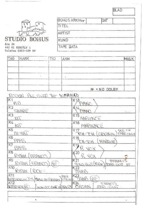 1977 Studio Gothenburg - working sheet for the "Rockin' All Over The World" album