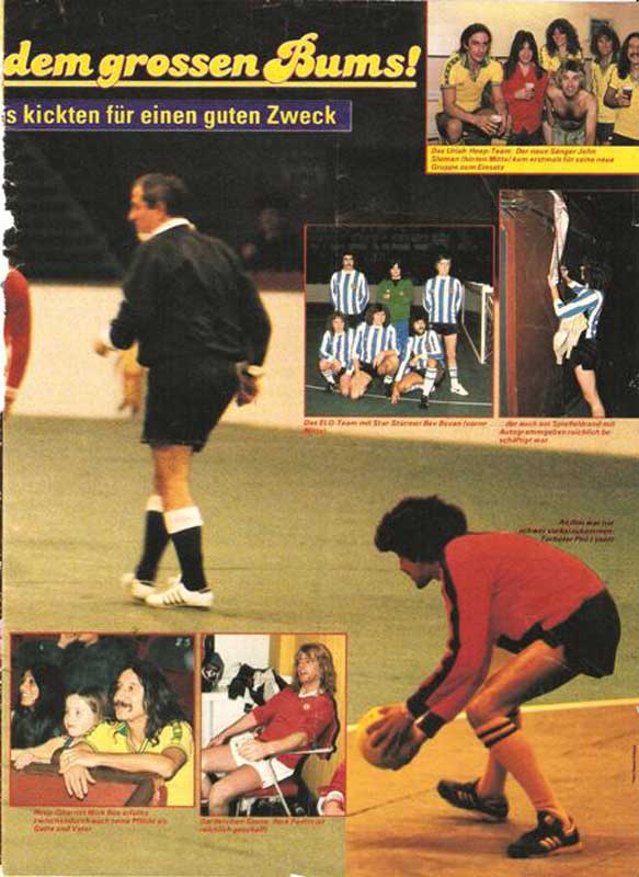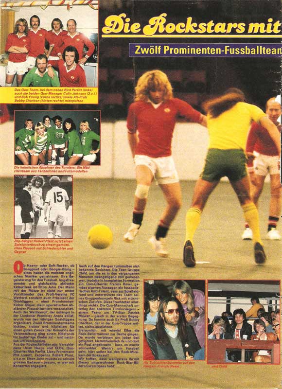 This pictures were taken at the "Goal diggers" Cup held at Wembley in 1976. There was a Quo team and the members were Bob Young, Colin Johnson, Rick Parfitt and Bobby Charlton. Other teams were from Uriah Heep, ELO and Thin Lizzy. One of the spectators was Francis Rossi (see pic at the bottom left) who supported the Quo team.