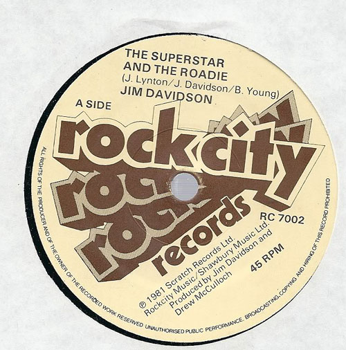 Jim Davidson single: The Superstar And The Roadie - UK 1981 Cat.No. Rockcity Records RC 7002 (by kind permission J.Hodgson)