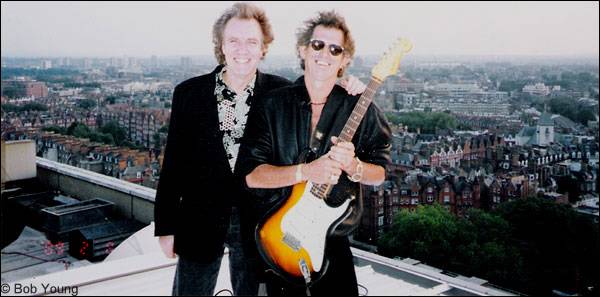 1993 with Stones guitarist Keith Richards taken on the roof of a hotel in London during the filming of the Stratocaster documentary.