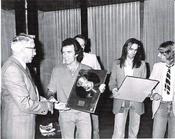 1979 'Whatever You Want' album launch in Switzerland. The Gold Album presentation is 'for outstanding sales in Switzerland of 'Piledriver', 'Hello' & 'Quo'.