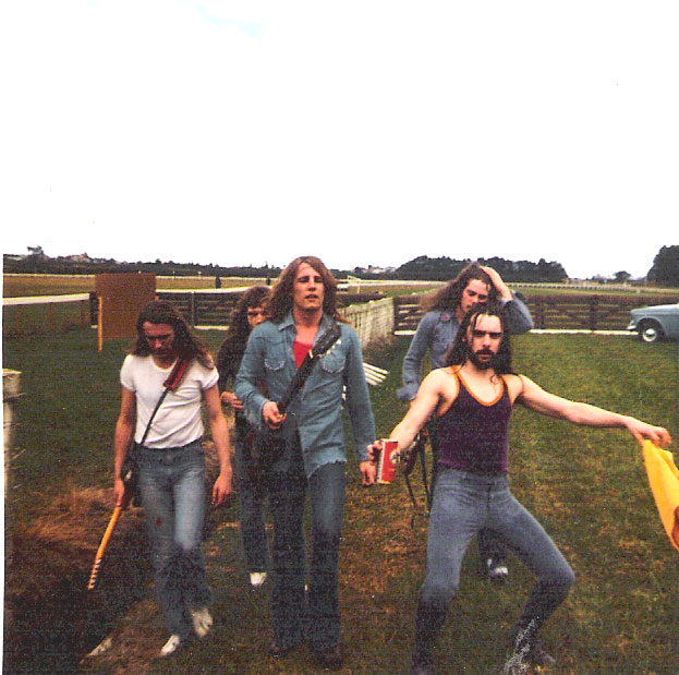 1973 Just off stage at a big outdoor gig on the first Oz tour with Slade. L-R Francis, Bob, Rick, Alan, John