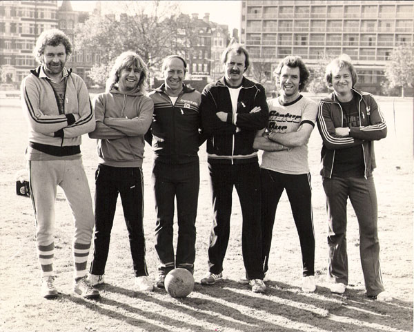 Six players in the worst five-a-side team to play Wembley. L-R ??, Rick Parfitt, Sir Bobby Charlton, Colin Johnson, me and Malcolm Kingsnorth.