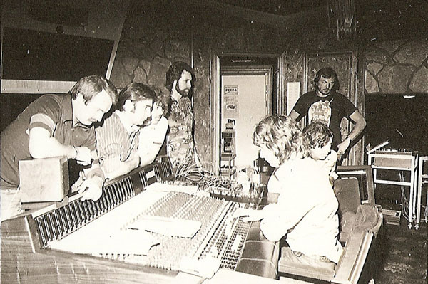 L-R Colin Johnson, Francis, Alan, Bob, Rick, Producer Pip Wiliams and (standing) roadie John Thompson (JT)