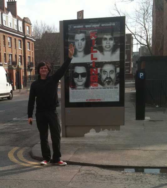 back to photo index 15th March 2011 Dublin Ireland. Joe Echo by a 'Killing Bono' movie poster. He wrote and produced all of the original songs for it.