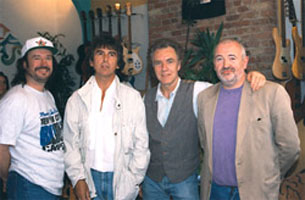 back to photo index 1994 L-R Ray Minhinnett, George Harrison, me, Guitar tech extraoardinare Alan Rogan