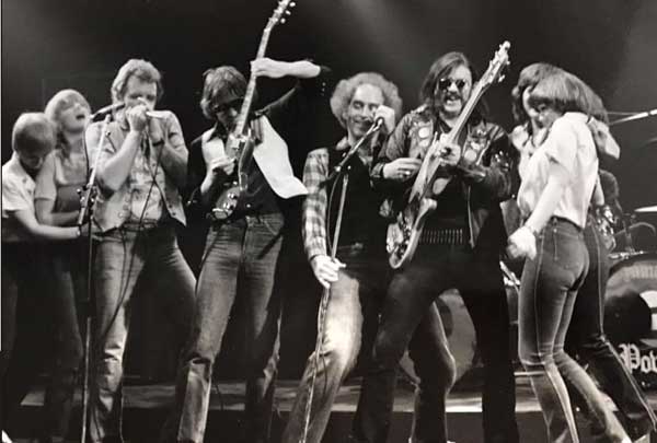 back to photo index 1981 Young & Moody Band with Lemmy, Y&M, Ed Hamilton, Cozy Powell and the Nolans Sisters